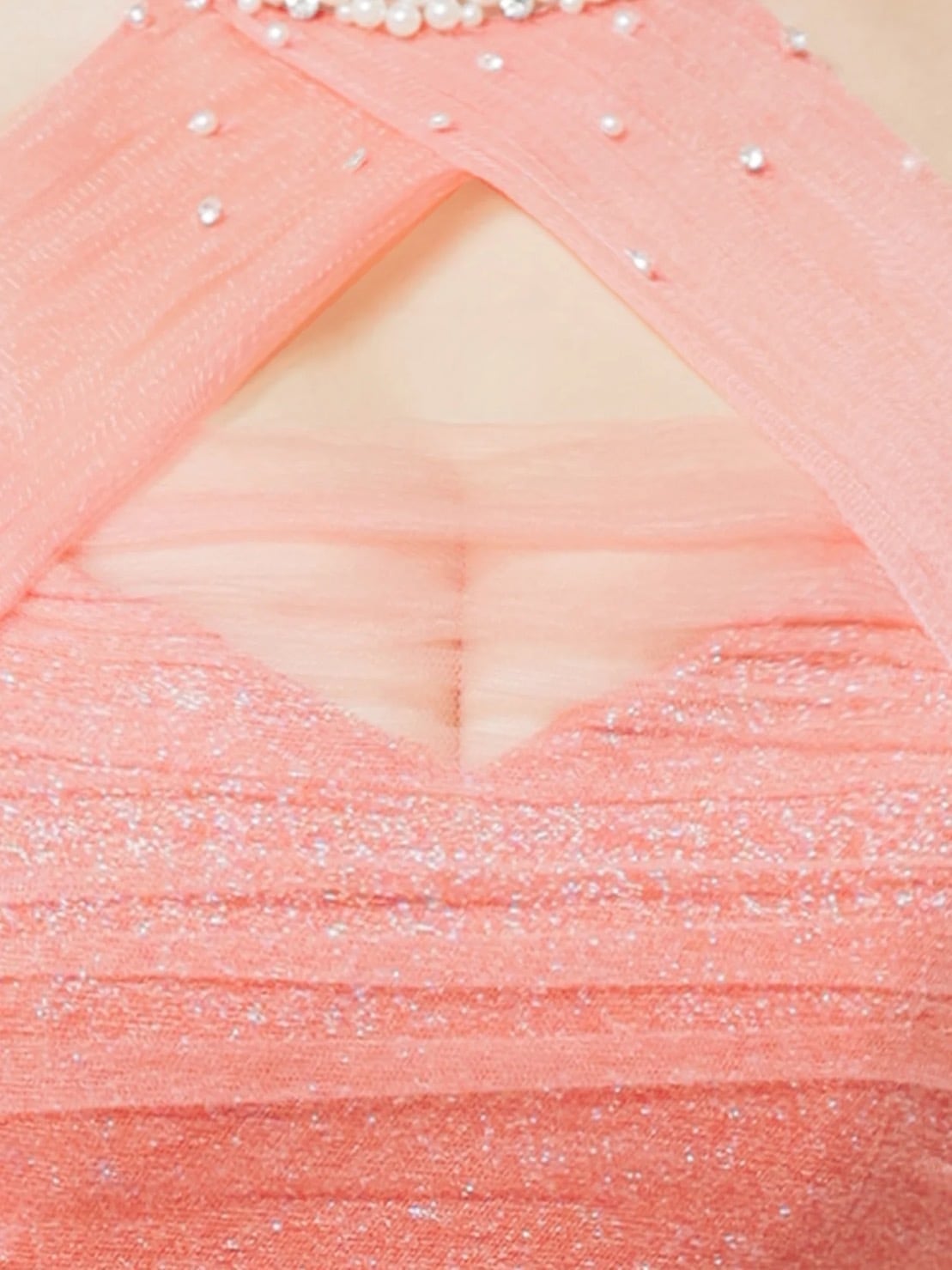 繊細なチュールがデコルテを美しく演出し、上品な印象に。