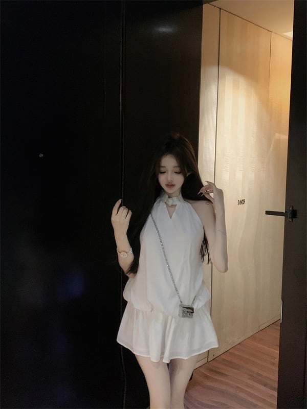 【make cat】【即納】2025新作 背中美人ふりふりホルターワンピース フリル 韓国風ワンピース