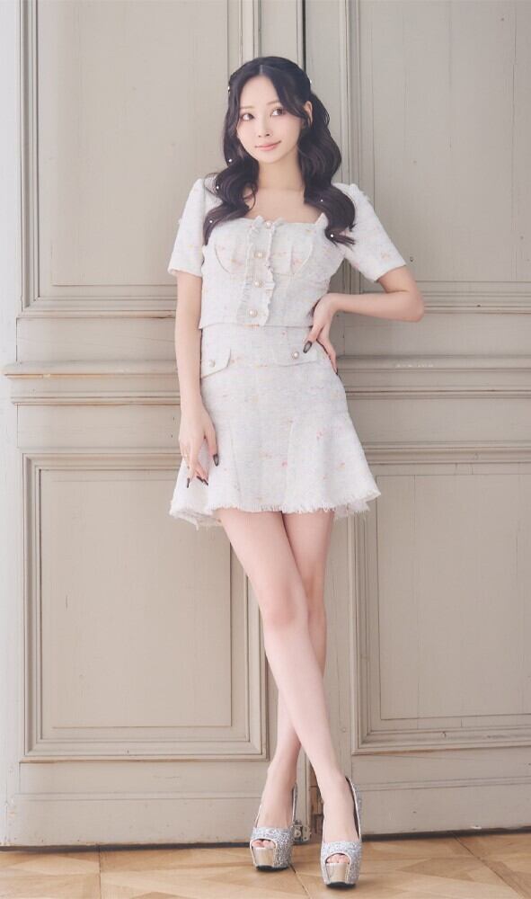 膝上のミニ丈は、スタイルアップ効果を生み出し、脚を長く見せる効果もあるので、女性らしさを引き立てます。
