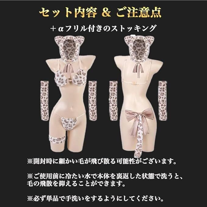 【セット内容】猫耳付きのフード+モコモコブラ+リボン&しっぽ付きTバック+アームカバー右手+アームカバー左手+ガーターリング1個+ストッキングの7点セット。ガーターベルトは1個のみですのでご注意ください。