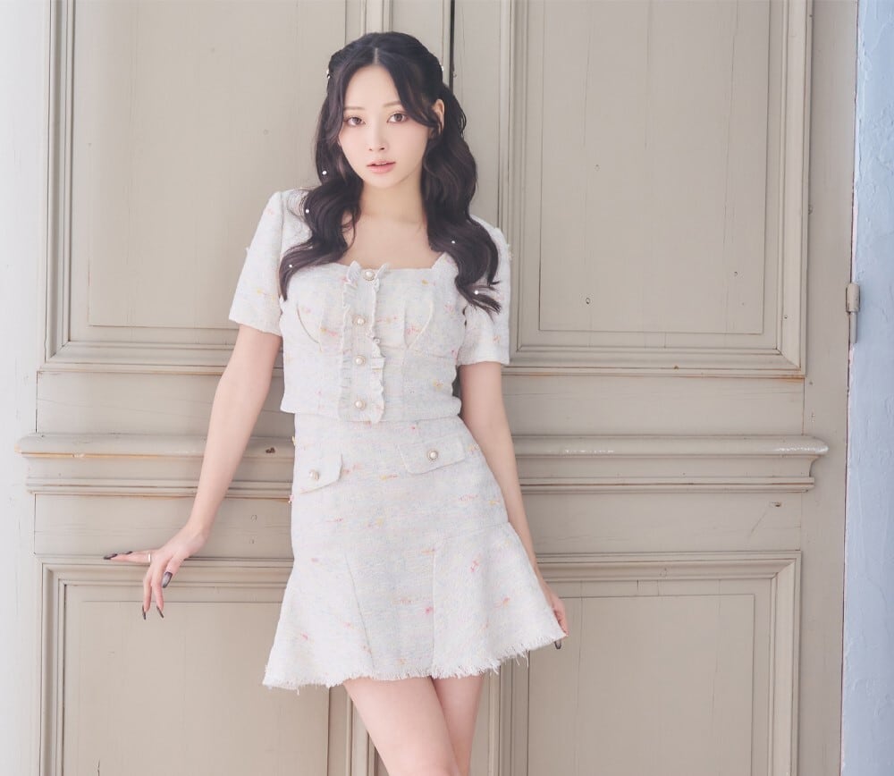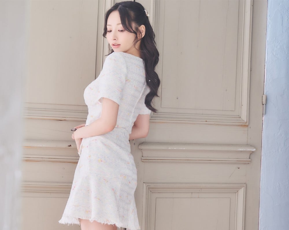 ツイード 半袖 スクエアネック マーメイド フレア パールボタン ミニドレス キャバドレス [1345]