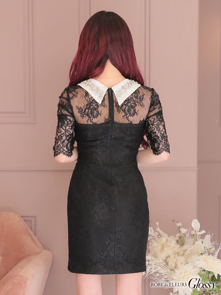 【ROBE de FLEURS Glossy】【即納】ビジュー付き襟モチーフ×レーススリーブタイトミニドレス(GL2468)