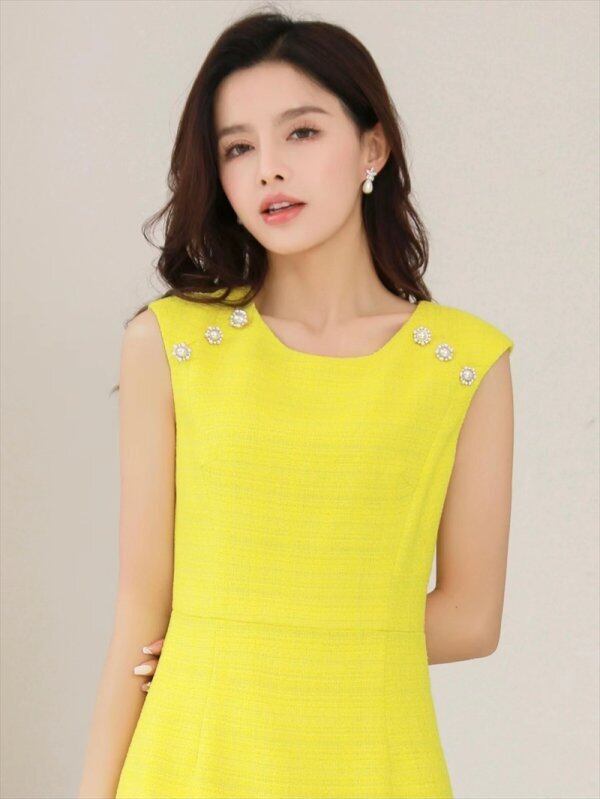 [ERUKEI]【即納】イエロー・ブラック・ピンク・ツイード・お花ビジュー・肩ポイント・ノースリーブ・マーメイド・ローウエスト・Aライン・ミニドレス・ワンピース [E1193-2]【税込】