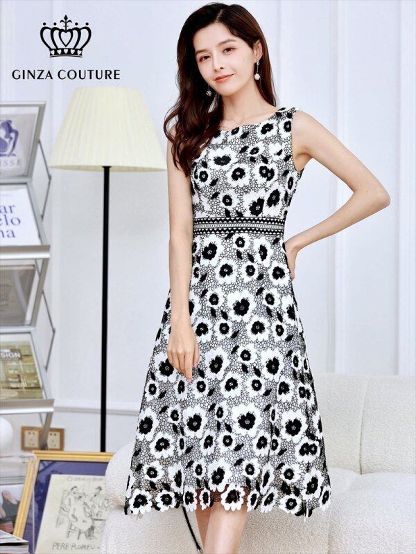 [ERUKEI]【即納】ホワイト・ブラック・フラワーレース・スカラップレース・ノースリーブ・Aライン・ミディアムドレス・ワンピース [c32047]【税込】