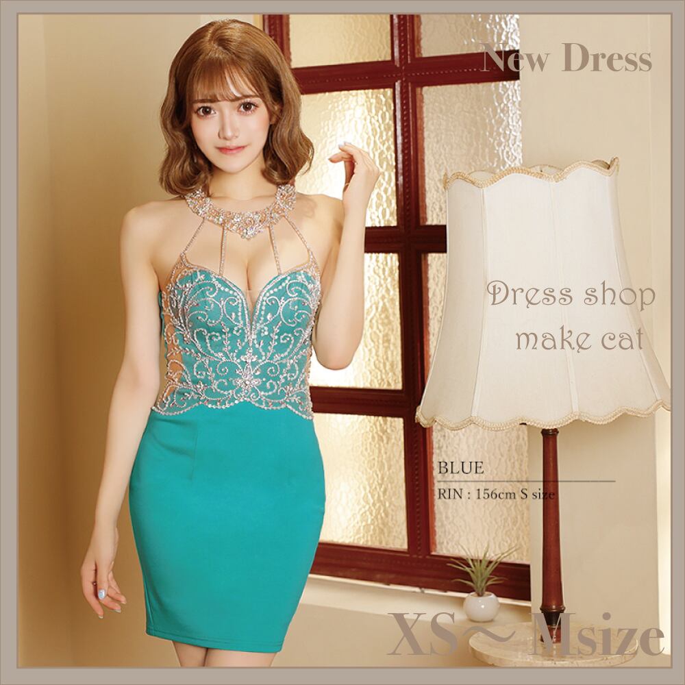 商品コメント 煌めくビジューが上品でエレガントな雰囲気をかもし出すホルターネック風タイトミニドレス。