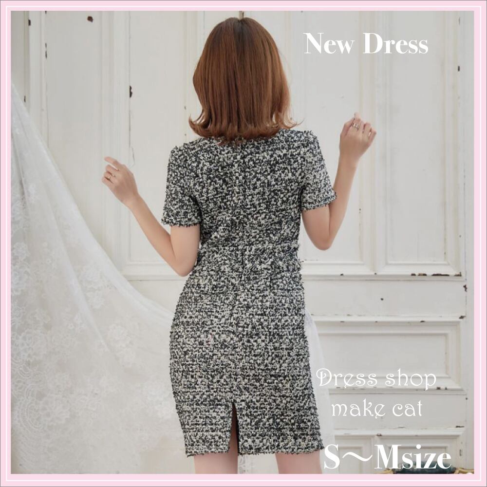 【make cat】SALE【即納】ツイード 半袖 袖あり ラメ糸 スパンコール フリンジ ワンピース タイト ミニドレス キャバドレス [1194]