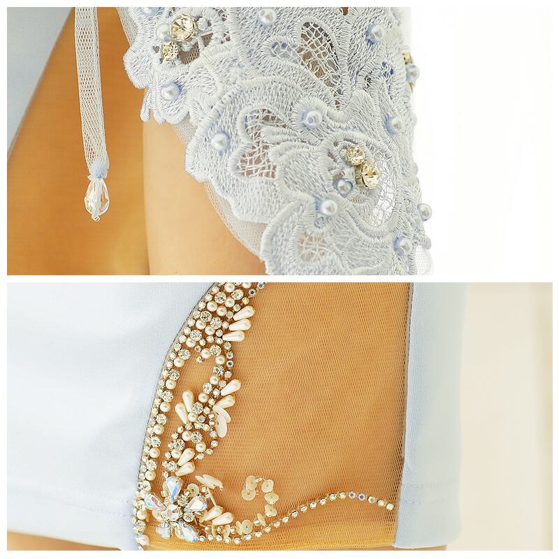 フラワーレースとパールビジューがアクセントのオープンショルダータイトミニドレスです。ボディラインにフィットするシルエットが美しく、開放感のある肩口がセクシーな印象を与えます。